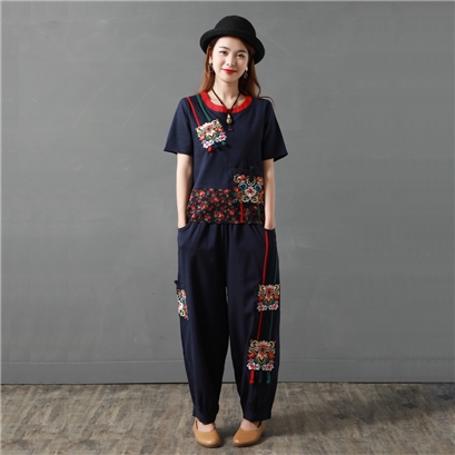 中國風棉麻吉祥繡飾拼接造型寬版褲裝 (3色任選) |