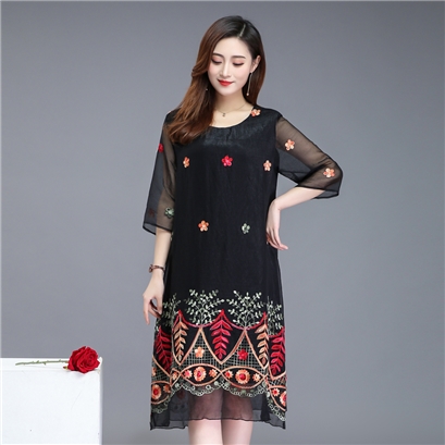 優雅繡花修身傘擺紗質寬袖圓領洋裝 (4款可選) |