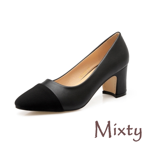 小方頭時尚撞色小香風異材質拼接百搭通勤粗跟鞋 黑 |