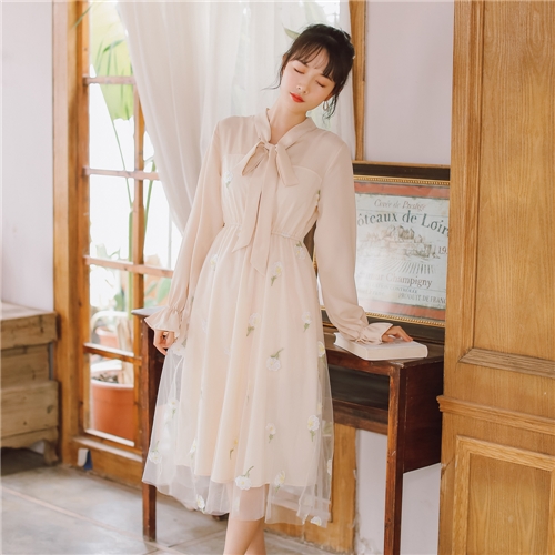 法式復古花朵刺繡氣質網紗唯美連身洋裝 杏 |