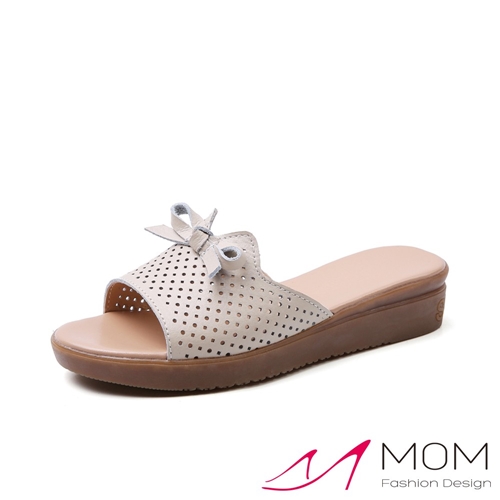 真皮甜美縷空蝴蝶結花邊氣質舒適厚底拖鞋 米 |