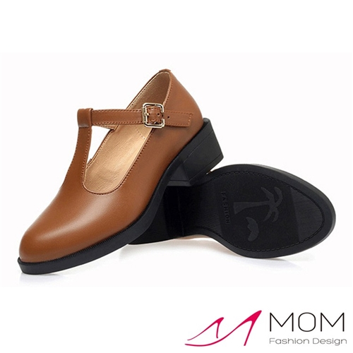 真皮細緻牛皮復古百搭T字帶搭釦造型粗跟鞋 卡其 |