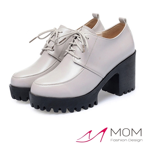 真皮細緻牛皮復古版型厚底防水台深口綁帶粗跟休閒鞋 灰 |