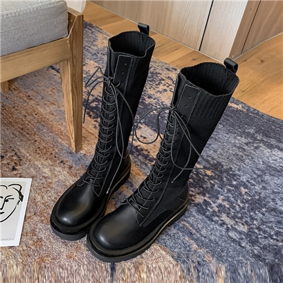 潮流時尚針織拼接復古長筒馬丁靴 黑 |