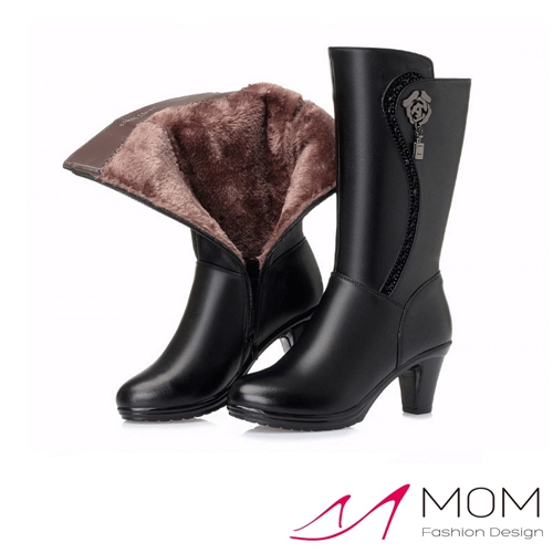 真皮唯美花飾貼鑽造型粗跟中筒靴 黑 |