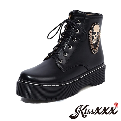 龐克風骷髏頭金屬鍊飾造型厚底綁帶馬丁靴 黑 |