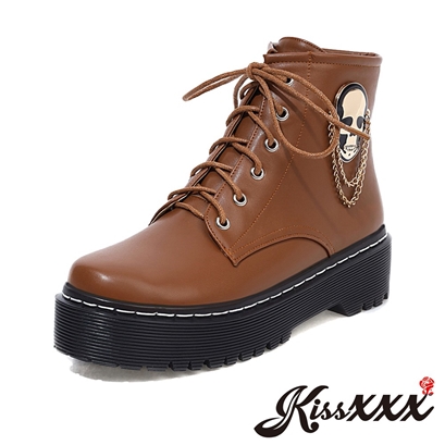 龐克風骷髏頭金屬鍊飾造型厚底綁帶馬丁靴 棕 |