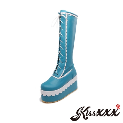 個性撞色蕾絲花邊鬆糕厚底蘿莉塔風格綁帶長靴 藍 |