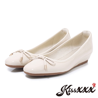 內真皮經典蝴蝶結造型舒適平底坡跟鞋 杏 |