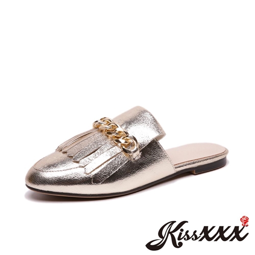 爆裂金屬亮皮流蘇鍊條造型包頭低跟穆勒鞋 金 |