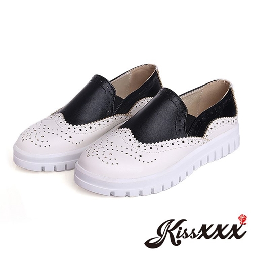 復古布洛克雕花撞色拼接厚底休閒樂福鞋 白 |