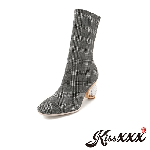 時尚彈力印花布特殊球體水晶跟貼腿中筒靴 格紋 |