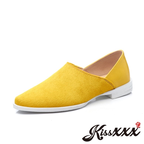 真皮馬毛活力色彩異材質拼接低跟休閒鞋 黃 |
