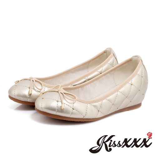 內真皮金屬格紋車線甜美小圓頭蝴蝶結造型內增高平底娃娃鞋 金 |
