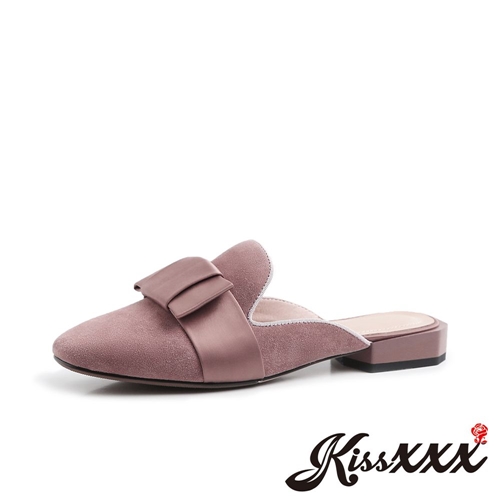 全真皮質感翻絨羊皮一字緞面蝴蝶結飾帶低跟拖鞋 穆勒鞋 粉 |