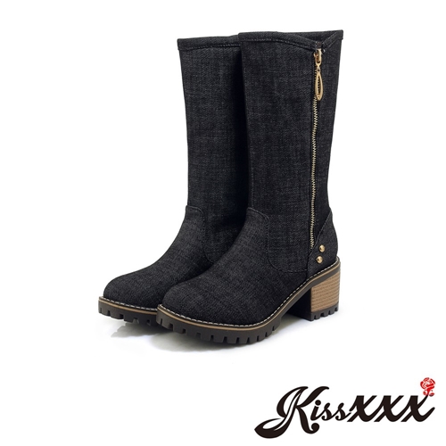 百搭時尚純色牛仔帥氣粗跟中筒靴 黑 |