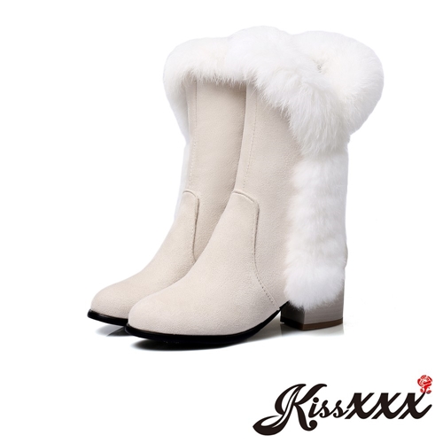 奢華兔毛拼接時尚個性粗跟中筒靴 白 |