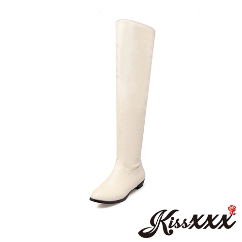 純色優雅小尖頭低跟騎士風過膝長靴 米 |