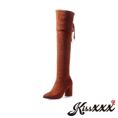 純色絨面小尖頭蕾絲綁帶粗跟過膝長靴 棕 |