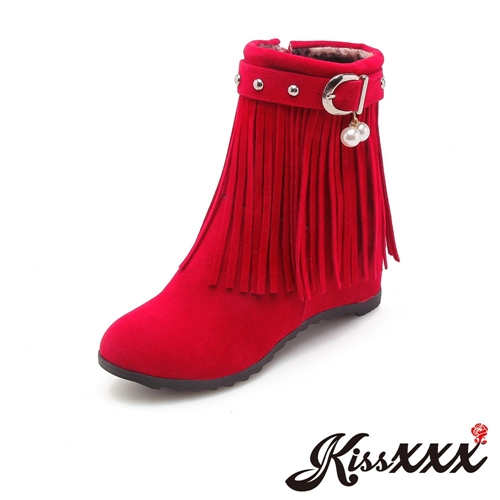 珍珠皮帶釦飾流蘇造型內增高短靴 紅 |