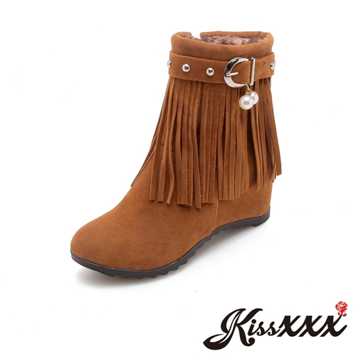 珍珠皮帶釦飾流蘇造型內增高短靴 棕 |