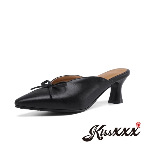 尖頭V口小蝴蝶結飾粗跟包頭拖鞋 穆勒鞋 黑 |