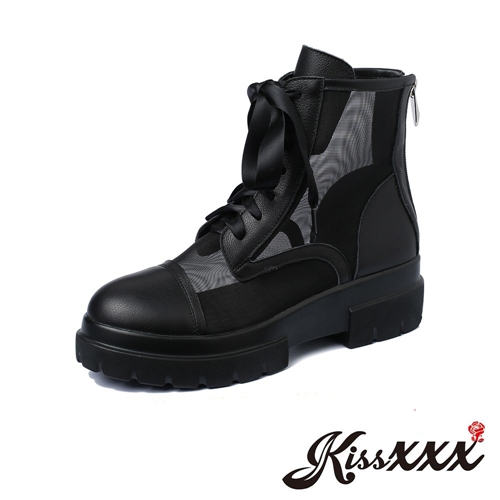 真皮頭層牛皮網紗拼接馬丁靴型輕量造型短靴 黑 |