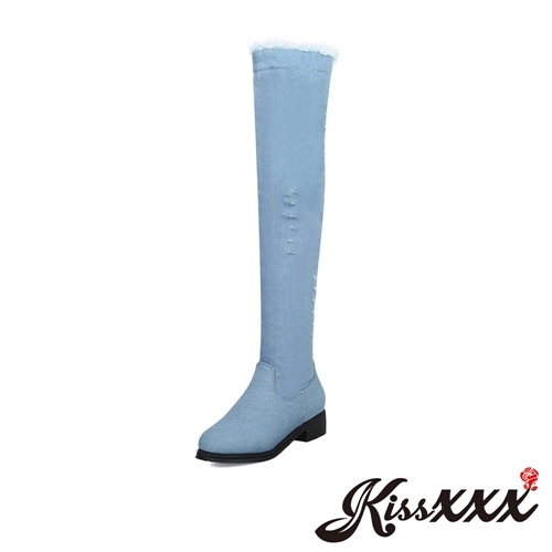 復古時尚破洞牛仔布毛邊靴口造型過膝長靴 水藍 |