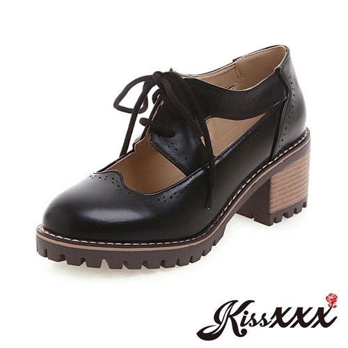 復古布洛克雕花縷空一字綁帶造型粗跟牛津鞋 黑 |