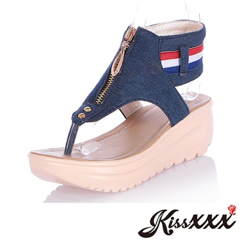 丹寧牛仔時尚織帶拼接拉鍊造型厚底夾腳涼鞋 藍 |