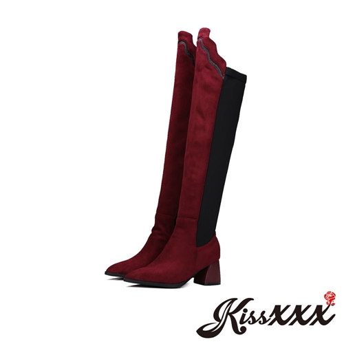 宮廷風金蔥壓線不規則靴口拼接尖頭粗跟過膝長靴 酒紅 |