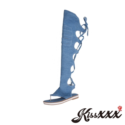 個性牛仔布割破造型夾腳縷空綁帶時尚過膝涼靴 藍 |