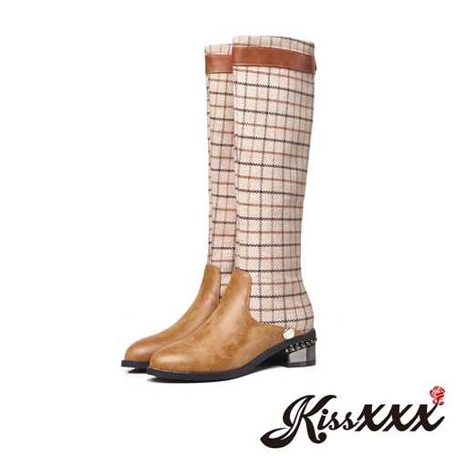 時尚英倫風異材質毛呢布拼接百搭粗跟長靴 棕 |