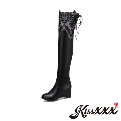 唯美蕾絲拼接後綁帶內增高平底過膝長靴 黑 |