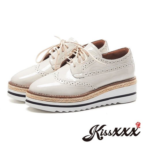 真皮經典漆皮復古布洛克雕花時尚厚底牛津鞋 米 |