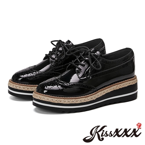 金屬質感亮漆皮復古布洛克雕花草編元素厚底牛津鞋 黑 |