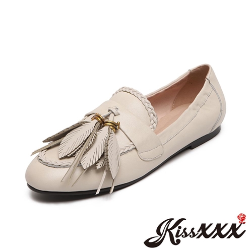 真皮頭層牛皮時尚麻花邊一字帶唯美羽毛流蘇造型時尚樂福鞋 米 |