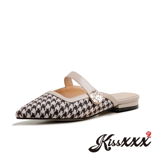 真皮頭層牛皮尖頭方口格紋布拼接一字帶金釦造型低跟拖鞋 杏 |
