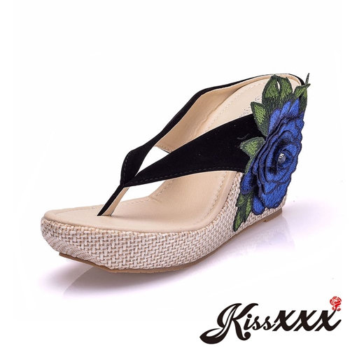 典雅刺繡花朵時尚楔形厚底人字拖鞋 黑 |