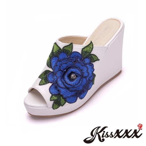 典雅刺繡花朵時尚楔形坡跟厚底拖鞋 白藍 |