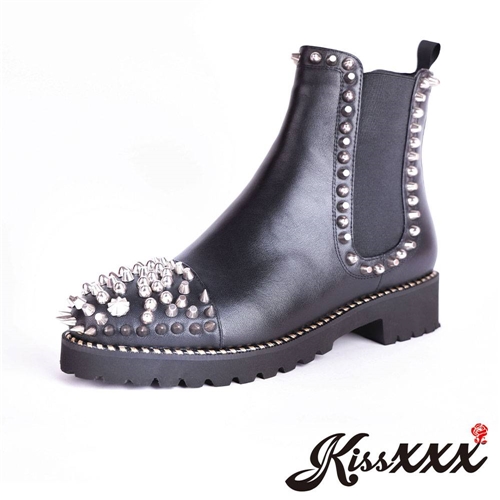 真皮頭層牛皮龐克風手工鉚釘飾面拼接重金屬搖滾切爾西短靴 黑 |