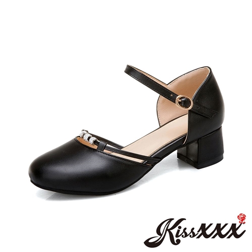 小圓頭淺口美鑽串珠造型粗跟涼鞋 黑 |