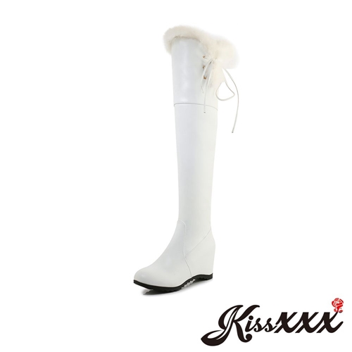 美腿效果毛絨靴口綁帶造型內增高平底過膝長靴 白 |