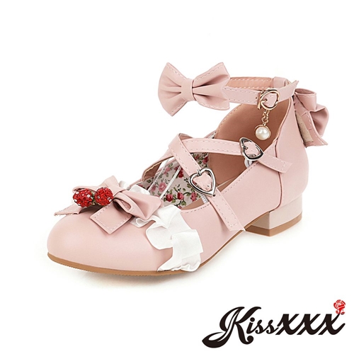 唯美小圓頭交叉繫帶珍珠吊墜蝴蝶結造型瑪莉珍低跟鞋 粉 |