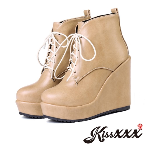 復古楔形防水台厚底坡跟綁帶短靴 米 |