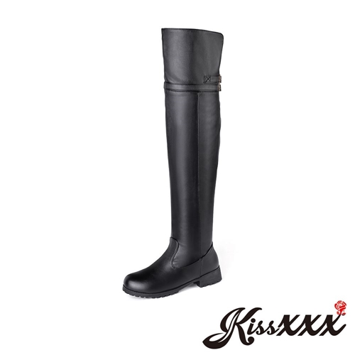 帥氣皮帶釦飾造型時尚粗跟過膝長靴 黑 |