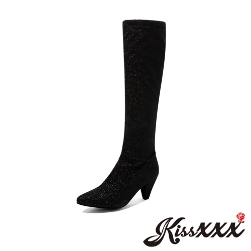 復古經典閃耀金蔥尖頭高跟長靴 黑 |