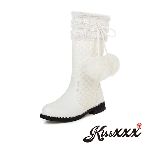 玫瑰花飾甜美小雪球綁帶造型公主風低跟中筒靴 白 |