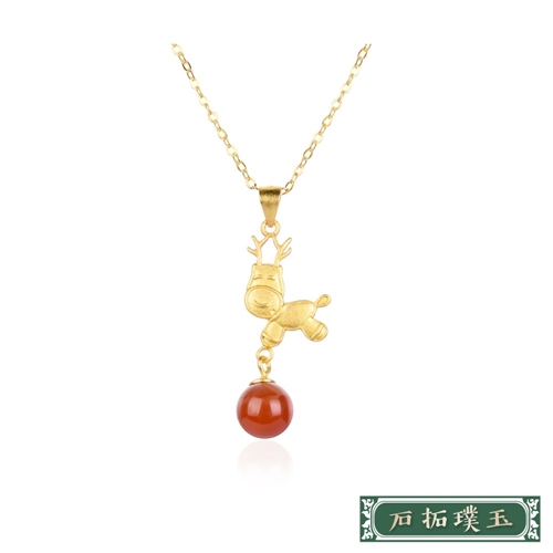 純銀925古法金可愛麋鹿南紅綴珠造型項鍊 *石拓璞玉* |