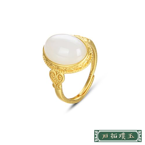 純銀925古法金輕奢砂金白玉寶石造型開口戒 *石拓璞玉* |